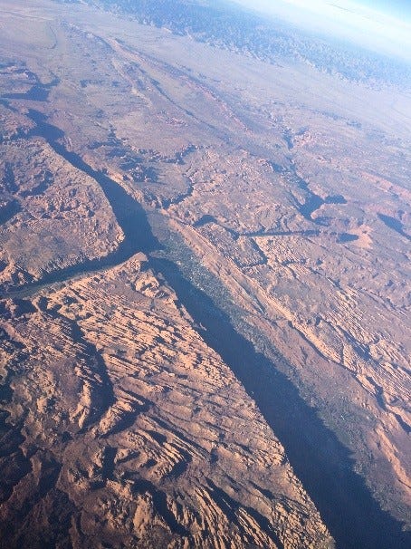 Moab Valley, intersected by the Colorado River as it enters into Canyonlands. Moonflower Canyon emerges inconspicuously from the cliffs left (west) of Moab Canyon.